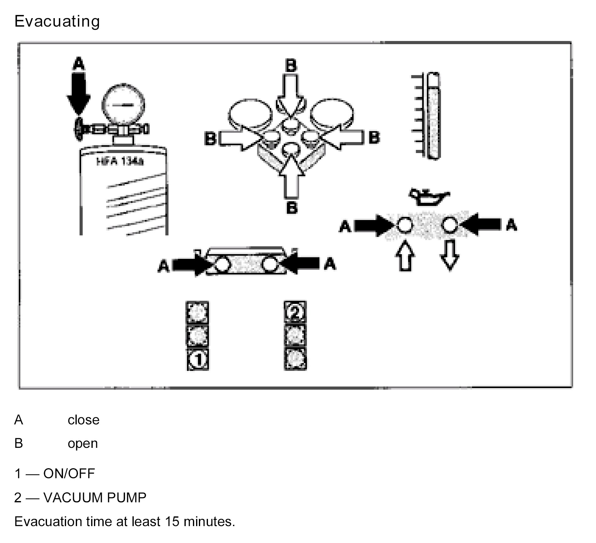 During all work on the air-conditioning system which necessitates opening the refrigerant system, the system contents must first be disposed of correctly. When doing so, follow the safety regulations.