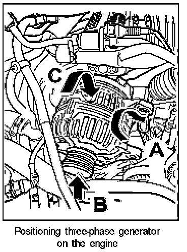 3. Insert the three-phase generator into the engine area -C-, then push upwards -B- and lift over the bracket -A-.