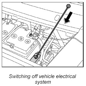 The battery disconnect switch, which is supplied via the positive terminal, is closed manually using the external switch lever and locked electromagnetically. The luggage compartment lid must not be open when doing this.