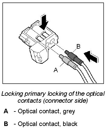 The LWL and the plug connections must not come into contact with fluids such as water, creeping compound, preservative, anti-freeze protection, cleaning agent. They will impair the MOST system function or cause complete system failure. Even plug connectors with plugged-in protective caps must not come into contact with the fluids listed.
