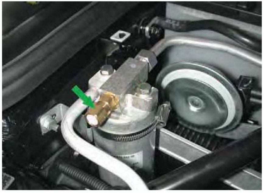 The refrigerant tank is installed in the fresh air chamber at front left, next to the battery. The pressure relief valve (see arrow) for the refrigerant system is also located here.