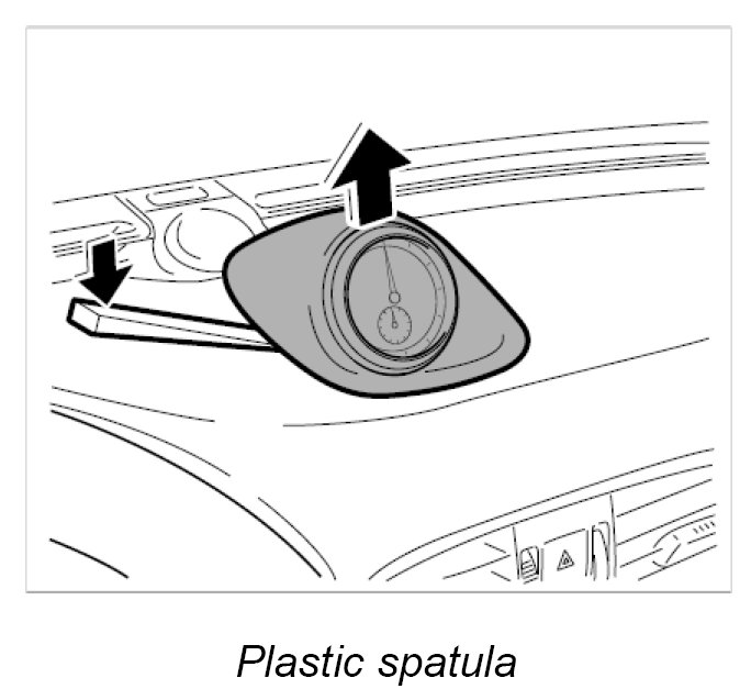 1. Insert a plastic spatula between the dashboard and the stopwatch. Lift up the stopwatch until its four clips unclip from the dashboard.