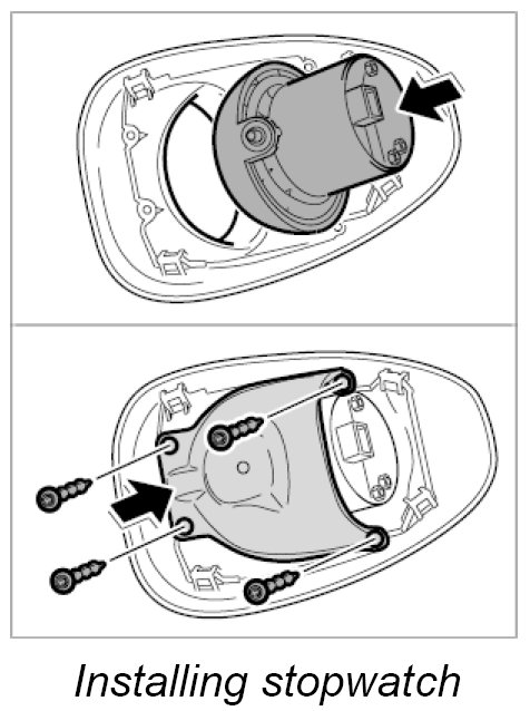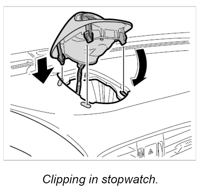 4. Run electrical lead into the dashboard, position the stopwatch with its cover over the dashboard and clip in the four clips.