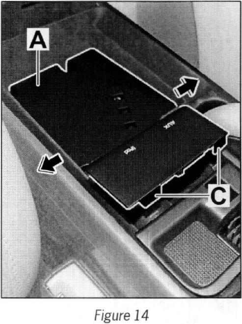 --> Carefully pull the center console apart in the area indicated by arrows (Figure 14) with the help of a second person.