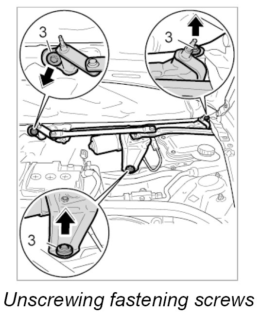 1. Unscrew the three fastening screws -3- for the wiper linkage and release and unplug the electric connector for the wiper motor.