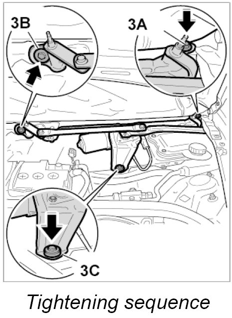 2. Position wiper linkage in the radiator tank and screw down the fastening screws -3A, 3B, 3,C- in turn.