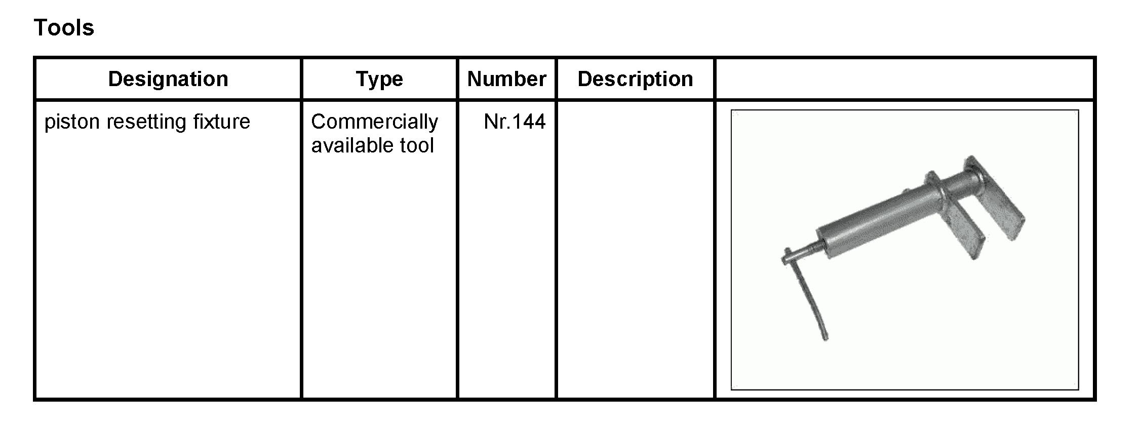 2. Use the piston resetting fixture Nr.144 to push brake pads back slightly and uniformly -direction arrow-. Make sure that no brake fluid runs out of the supply tank - drain it if necessary.