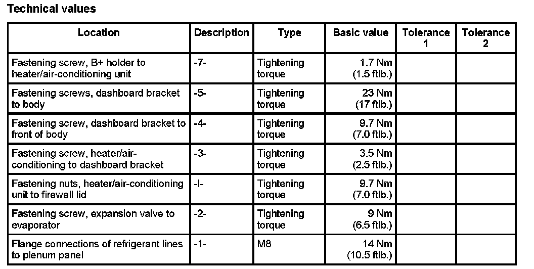 15. Screw down holder of heater/air-conditioning unit with the fastening screw -3-. - Tightening torque: 3.5 Nm (2.5 ft. lbs.)