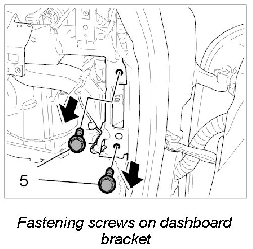 7. Unscrew the two fastening screws -5- for dashboard bracket to right side of body.