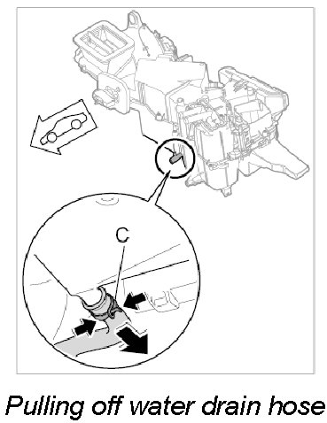 12. Lay down the air conditioner, release clamp for water drain hose -C- and pull off the water drain hose from the heater/air-conditioning unit.