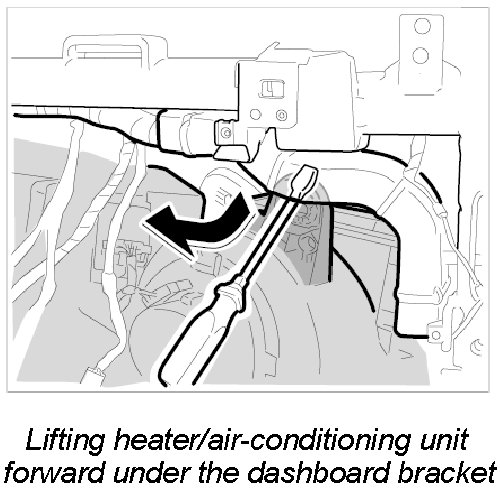 13. Carefully lift heater/air-conditioning unit forward with a screwdriver under the right side of the dashboard bracket.