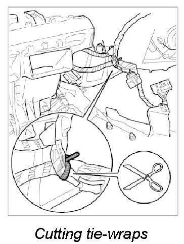 16. Cut tie-wraps of electric line (vehicle wire harness to heater/air-conditioning unit wire harness) with side cutters. Remove vehicle wire harness.