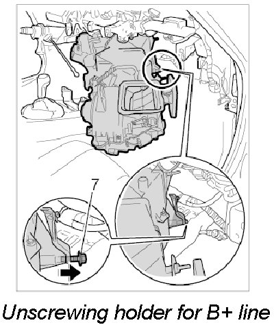 17. Pull air conditioner forward on the right side, unscrew fastening screw -7- for B+ line holder and remove holder for heater/air-conditioning unit.