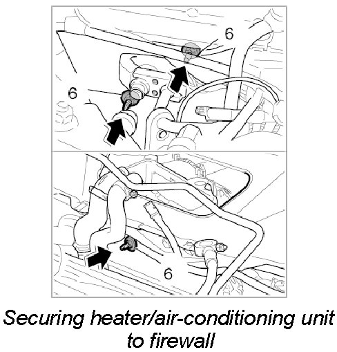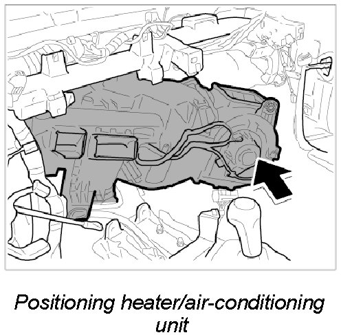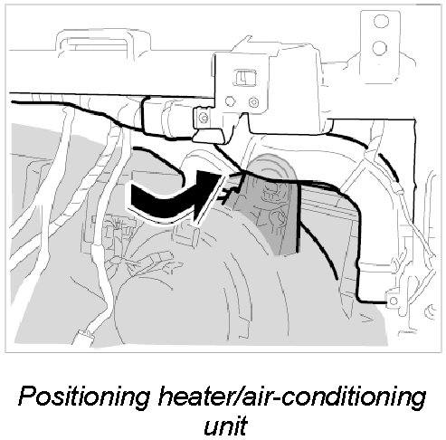 2. Lift heater/air-conditioning unit over the centre console and position under dashboard bracket.