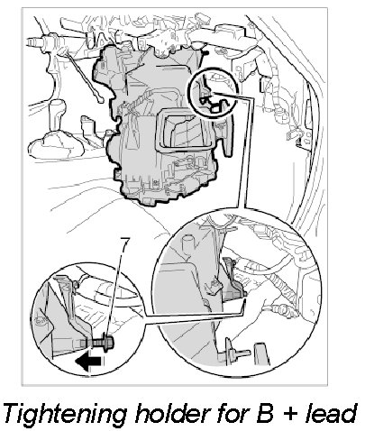 3. Position holder for the B+ line on the heater/air-conditioning unit and tighten with the fastening screw -7-. - Tightening torque: 1.7 Nm (1.5 ft. lbs.)