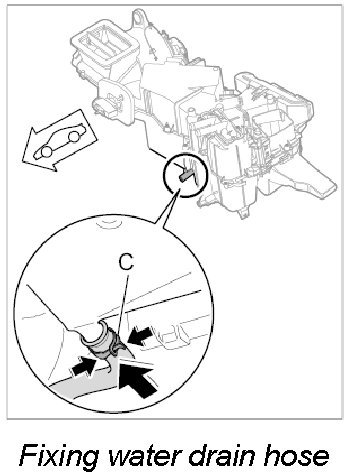 7. Check water drain hose for damage; if drain hose shows no sign of damage, connect hose to the drain on heater/air-conditioning unit and fix with the clamp -C-.