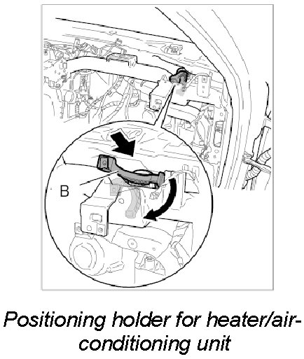 9. Guide holder -B- for the heater/air-conditioning unit over the dashboard bracket, push through the mounting of the heater/air-conditioning unit and turn through 90 degrees.