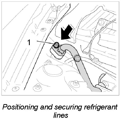 1 8. Replace sealing rings for refrigerant lines and wet with refrigerant. Position refrigerant line and tighten with fastening screw -1-. M8: 14 Nm (10.5 ft. lbs.)