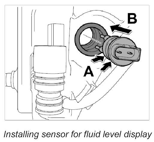2. Apply a suitable rubber lubricant (tyre mounting paste) to the sealing surface -arrows A- and press the sensor for fluid level display into the rubber seal -arrow B- until the sensor is felt to engage.