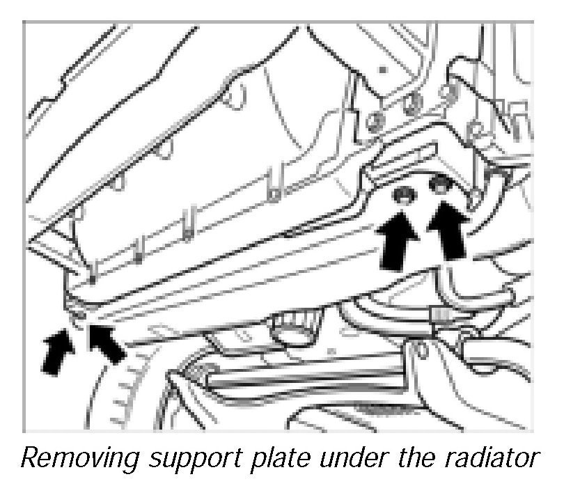 1. Remove the support plate under the radiator. To do this, loosen the four fastening screws.