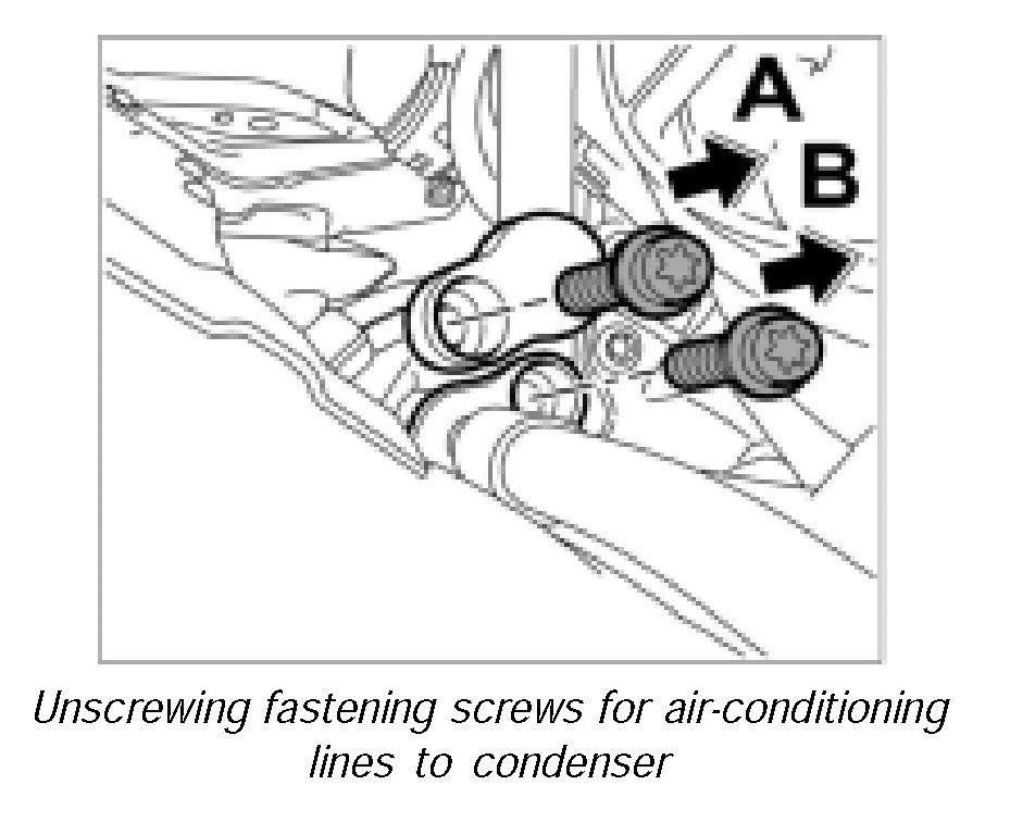 2. Unscrew the fastening screws -A and B- for the air-conditioning lines to the condenser, remove the lines and close them off so that they are air-tight.
