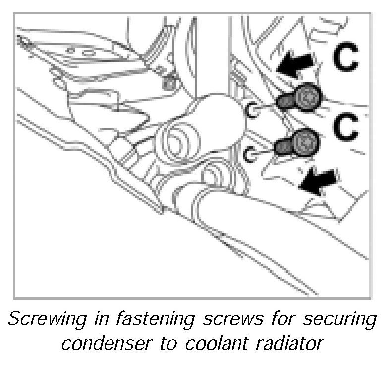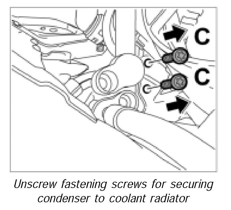 3. Unscrew both fastening screws -C- for securing condenser to the coolant radiator (left direction of travel).
