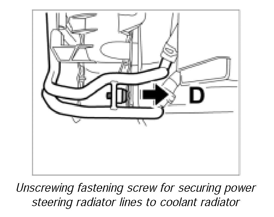 4. Unscrew the fastening screw -D- (left direction of travel) for securing power steering radiator lines to coolant radiator.