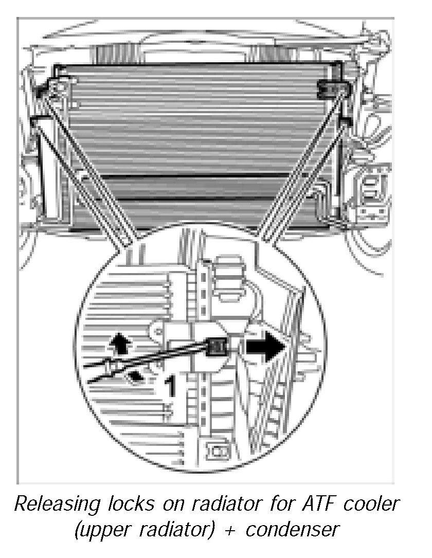 5. Lift both locks for the ATF cooler and air-conditioning condenser with a screwdriver -1- and push down -arrow-.