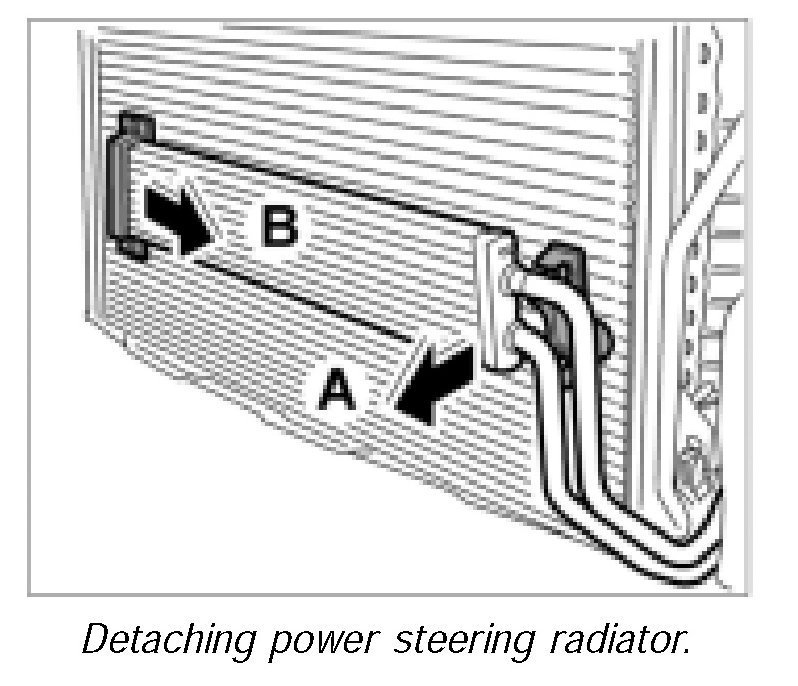 6. Detach power steering radiator from condenser -Arrow A- and remove from the support -Arrow B-.