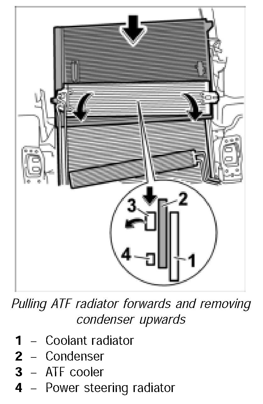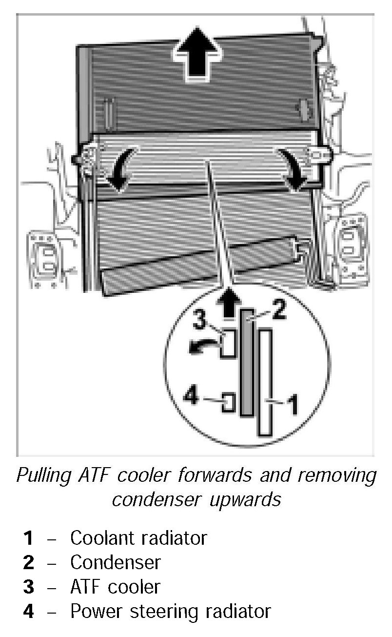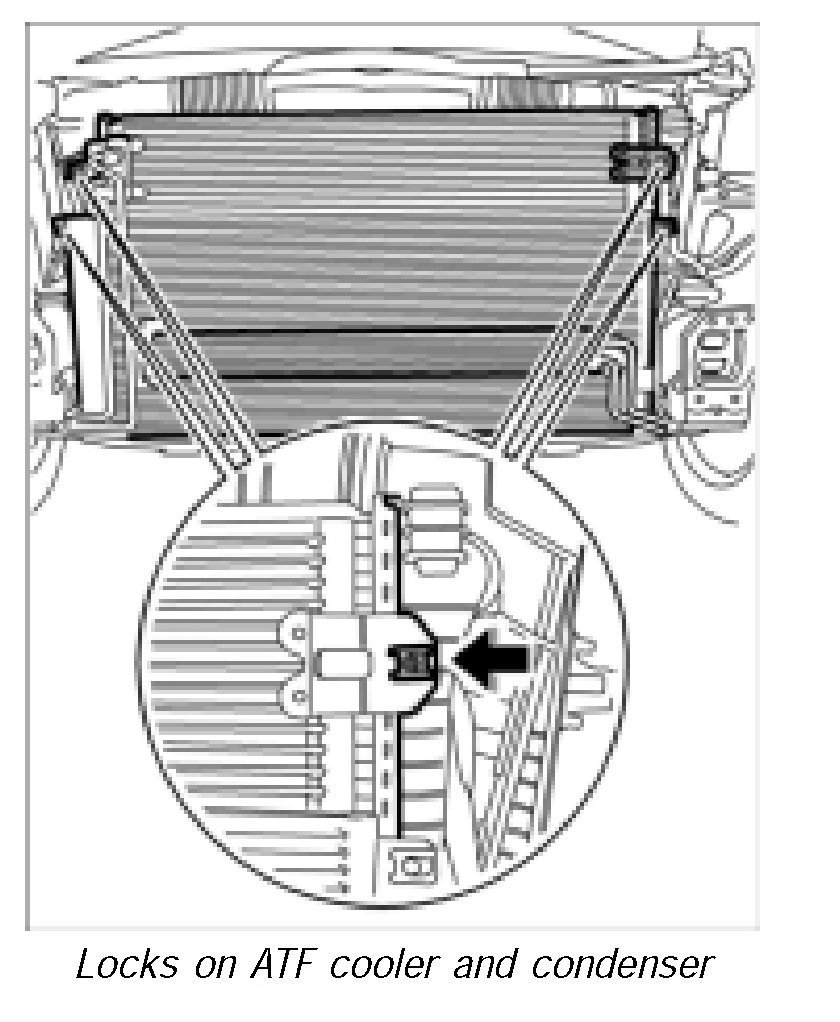 3. Engage the condenser and the ATF cooler in the mounts and clip in both retaining clips on the condenser and on the coolant radiator.