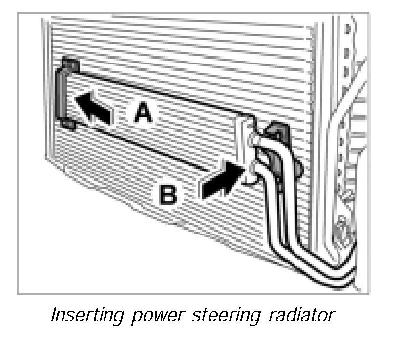 4. Insert the power steering radiator in the support on the condenser -Arrow A- and engage the lines in the support -Arrow B-.
