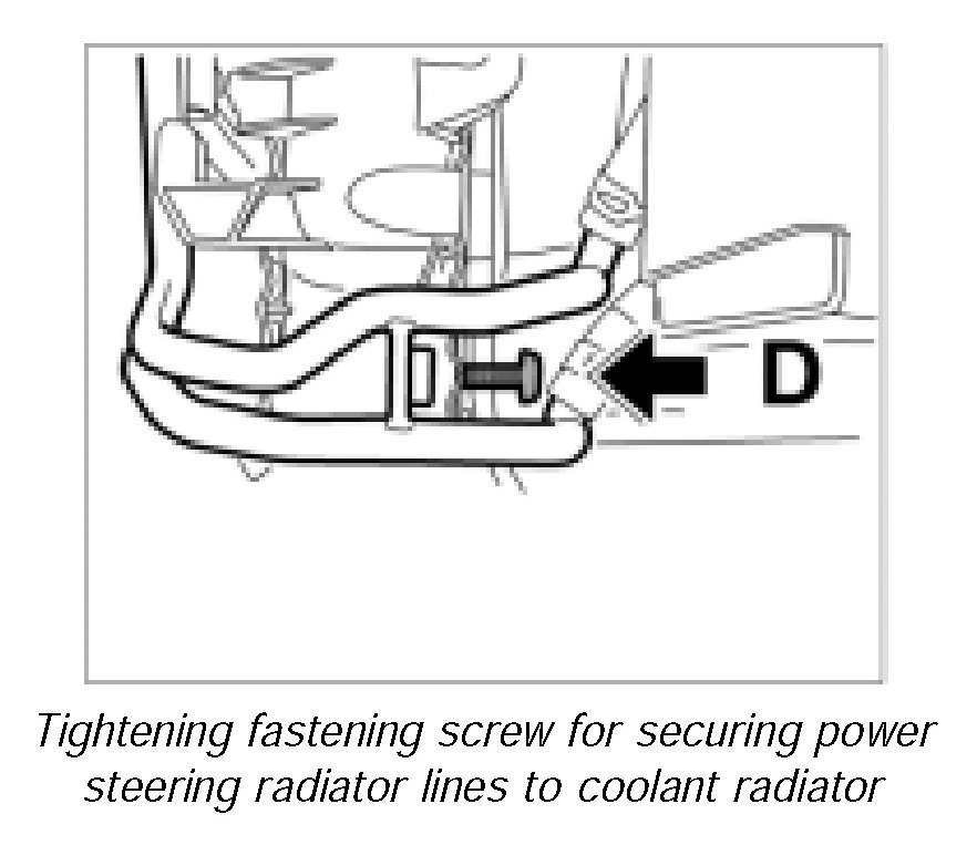 5. Screw in the fastening screw -Arrow D- (left direction of travel) for securing power steering radiator lines to coolant radiator. Tightening torque 6 ftlb.