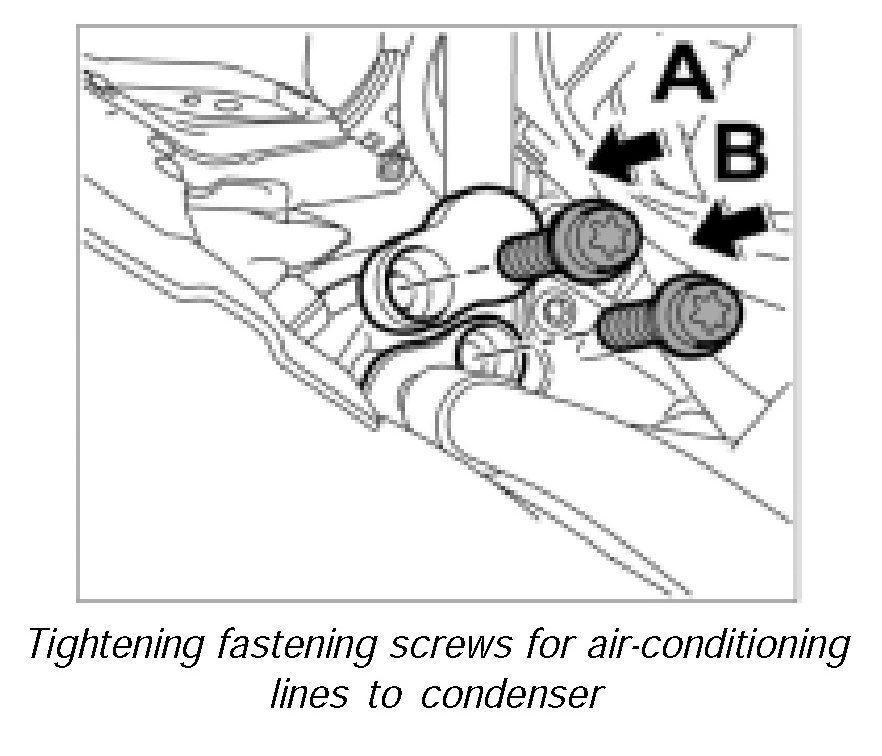 7. Position the refrigerant lines and attach them to the condenser with the fastening screws -A and B-. Tightening torque 9 ftlb.