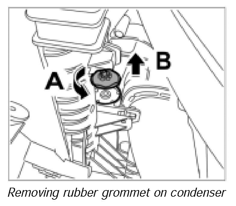 2. Unscrew rubber grommet on condenser -arrow A- and remove upwards -arrow B-.