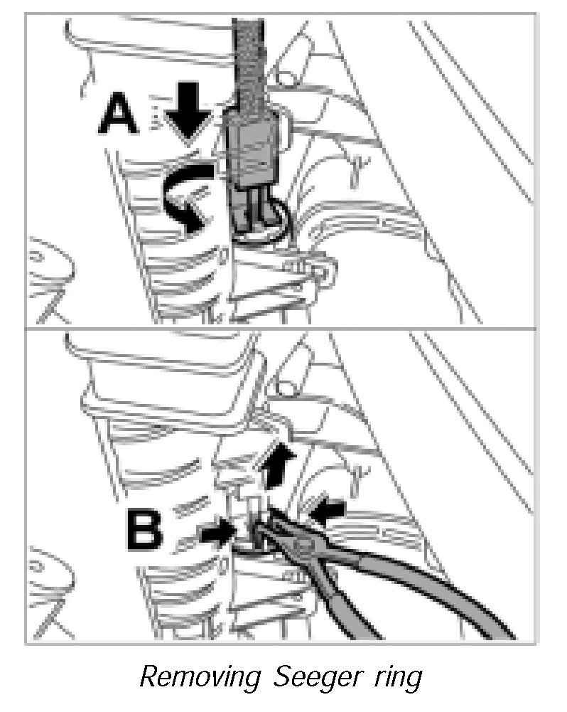 3. -A- Using a slide hammer kit NR.168, push plug down and turn Seeger ring until accessible from air filter.
