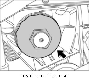 6. Remove the oil filter housing vertically downwards. Drain the remaining oil into a disposal container.