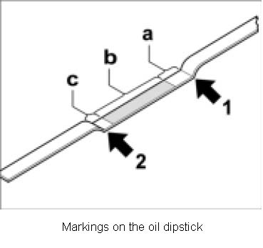 c - Area from min. mark to cross-hatched area: refill engine oil up to the cross-hatched area.