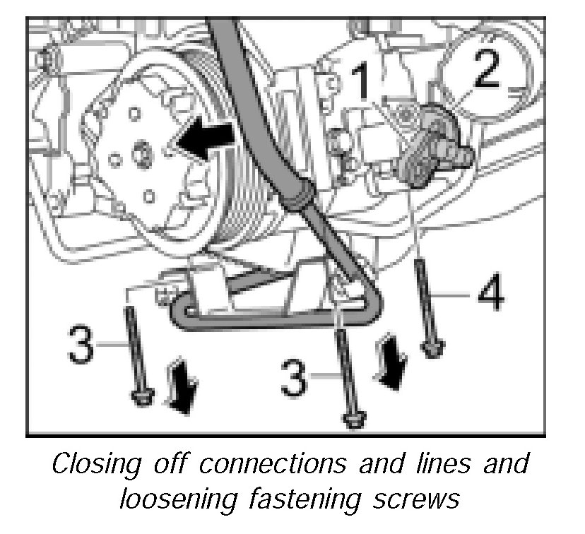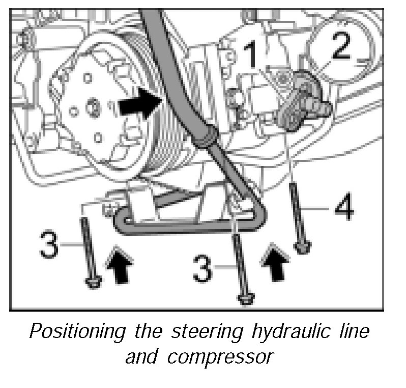 8. Screw down the compressor and steering hydraulic line with the fastening screws -3- Tightening torque 17 ftlb. and -4- Tightening torque 34 ftlb.