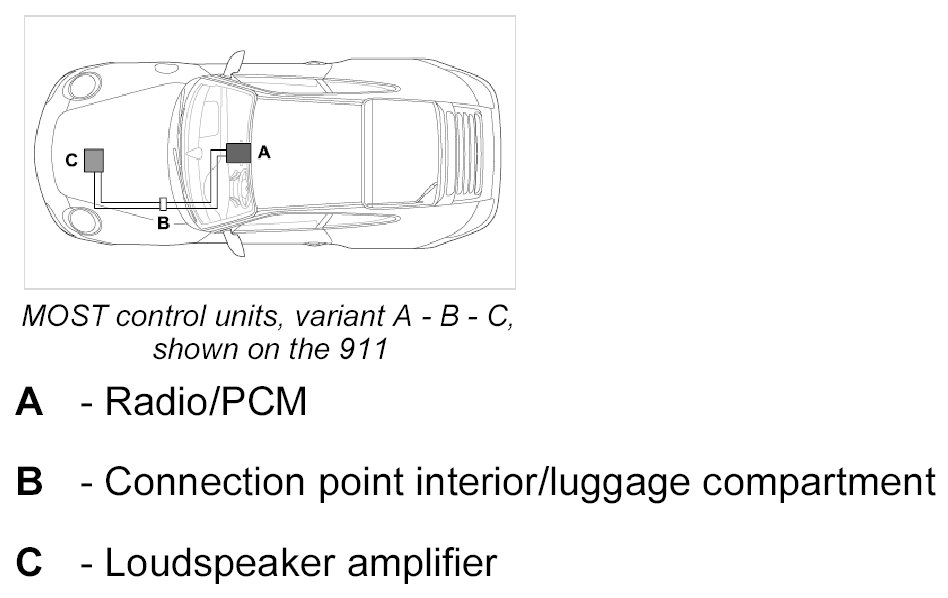 INFORMATION: Depending on the equipment I No., the installation positions of the audio components in the front luggage compartment differ.