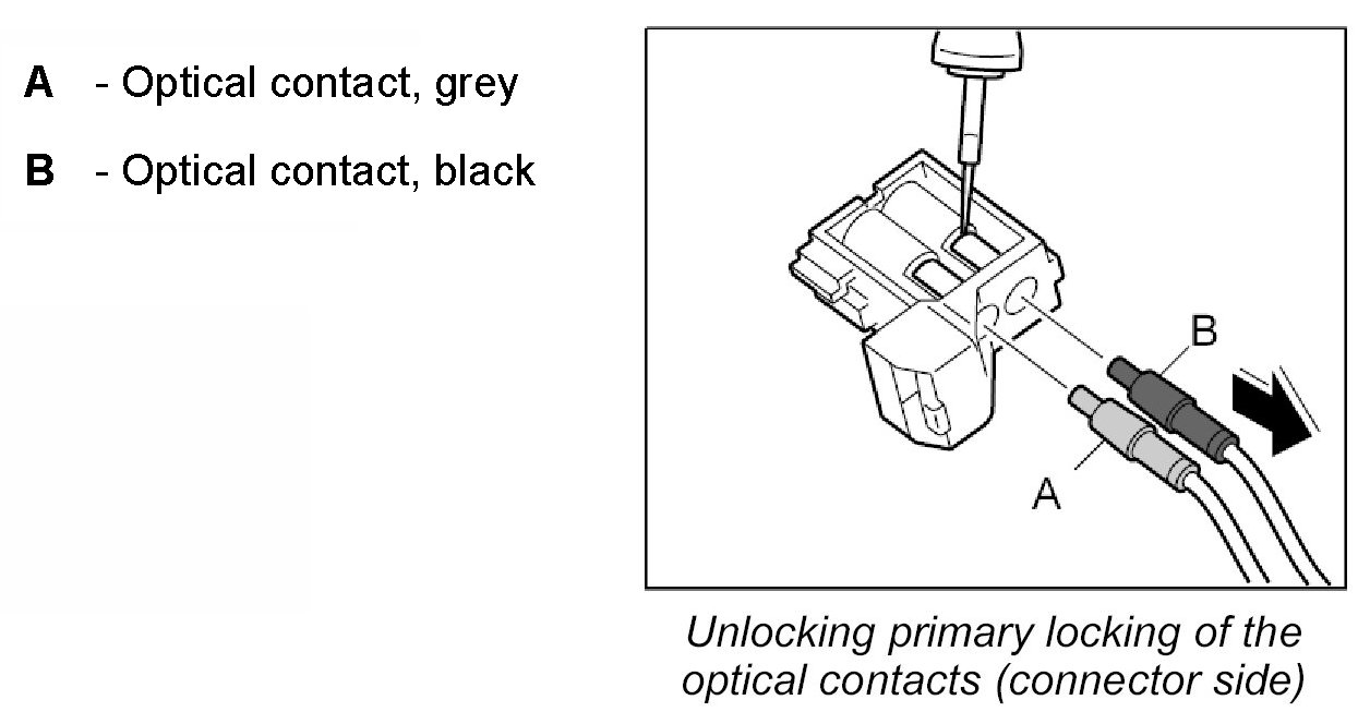 4. Carefully pull on the optical waveguide -A and B- in -direction of arrow-. If it is not possible to pull out the optical waveguide, check again if the locking mechanism is completely released.