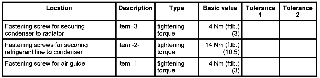 2. Engage the condenser on the radiator bracket and secure with the fastening screw -3-.