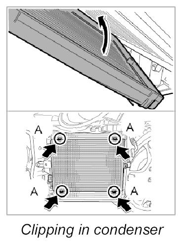 1. Insert condenser into the retaining bracket and clip it into place -A-.