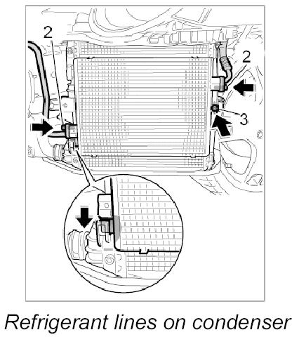 INFORMATION: When loosening or tightening the M8 refrigerant lines on the condenser, always counter with a 21-mm open-ended wrench.
