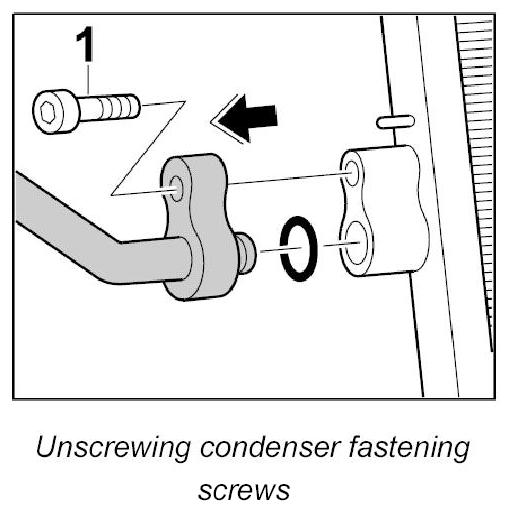 1. Unscrew the fastening screw -1- for the condenser line and pull the line out of the condenser.