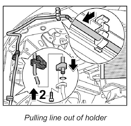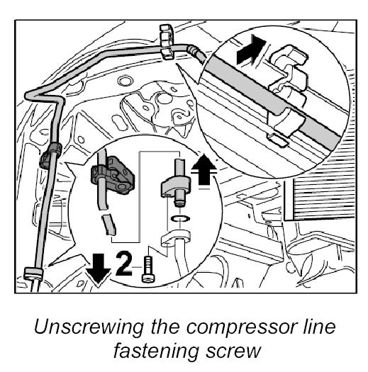 3. Unscrew the fastening screw -2- for the line to the compressor and pull the line out of the compressor line.
