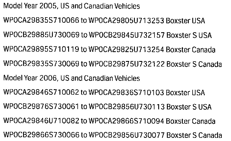 Use the VIN range previously shown as a general guideline. The VIN can be checked in the Porsche e-DCS/WWS for confirmation of an open recall campaign. Also, the VIN can be checked via the VRU (Voice Response System) for any open listing.