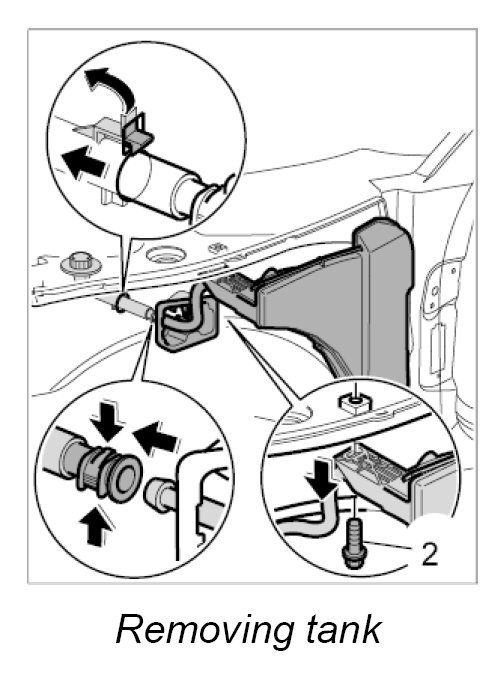4. Unscrew fastening screw -2- and pull the tank from the mounting point on the A-pillar.