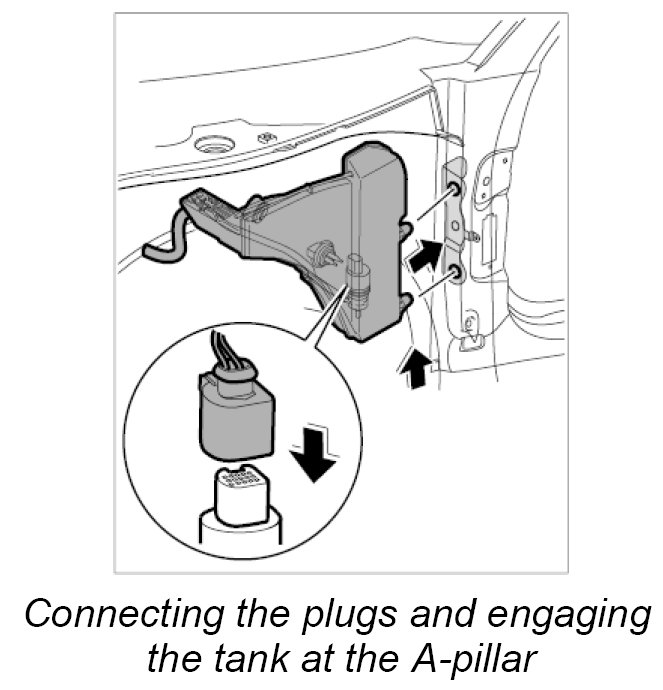 1. Retain the tank in the wheel housing and push in electrical plug connections until plugs are felt to engage.