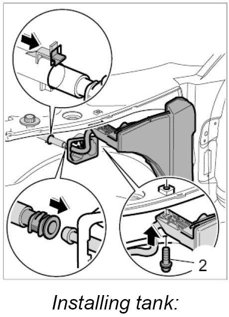 2. Engage the windscreen washer tank in the A-pillar and secure with the fastening screw -2-.