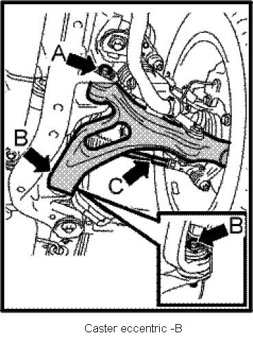 Specified tightening torque for fastening nut to caster eccentric -B- = 133 ft lb.